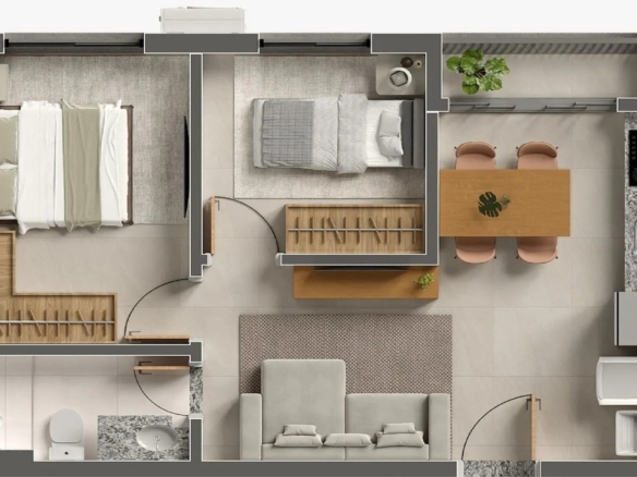 - Planta 43m²: 2 quartos com varanda integrada, ideal para quem busca praticidade e sofisticação.